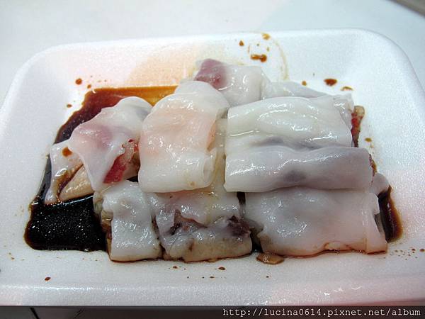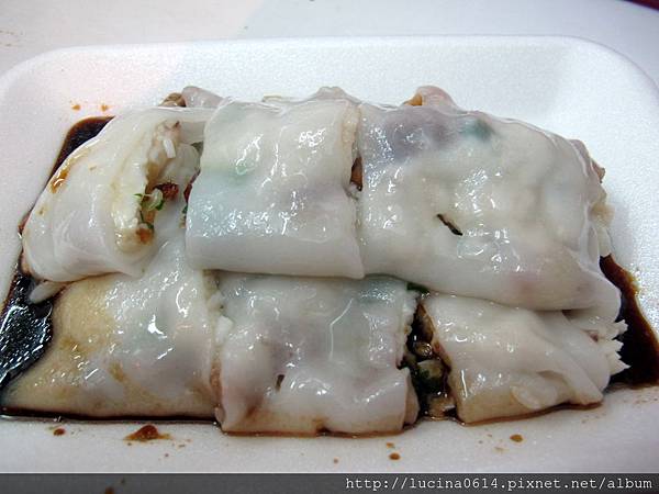 這是牛肉臘腸腸,腸粉眞的很滑嫩,像絲絨一般,一不小心就滑進喉嚨裡了。中間的內餡也不遜色,臘腸香氣很濃,搭配上Q彈的牛肉,我們不約而同的直說真的很好吃~~~